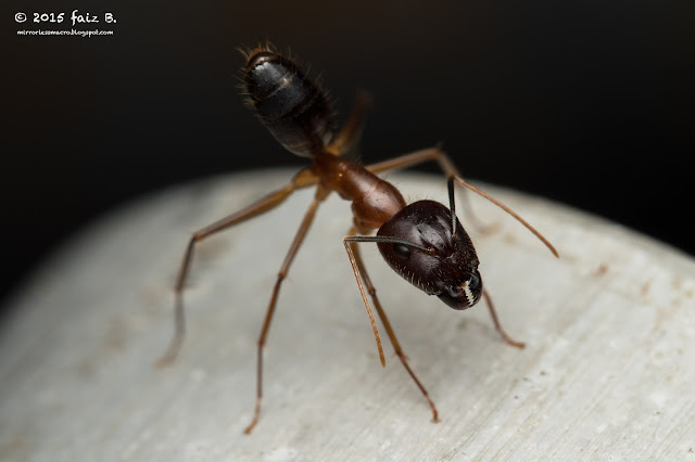 One of my favourite subjects to photograph besides spiders, and definitely one of the hardest, due to its size and light-reflective nature. I really liked the soft catchlight on this ant (Camponotus sp.)!