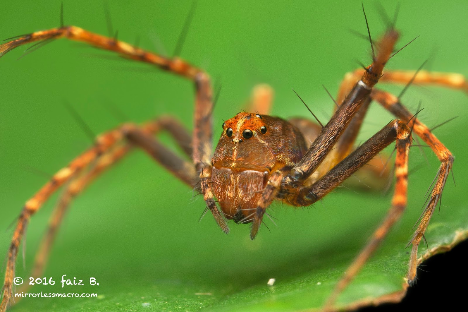 42. Female Phintella cf. versicolor, Up-close. It has a legspan of around 5mm. In my opinion, one of the harder spiders to photograph on this trip due to its size and colour - Very easy to overexpose, especially the setae on the clypeus!